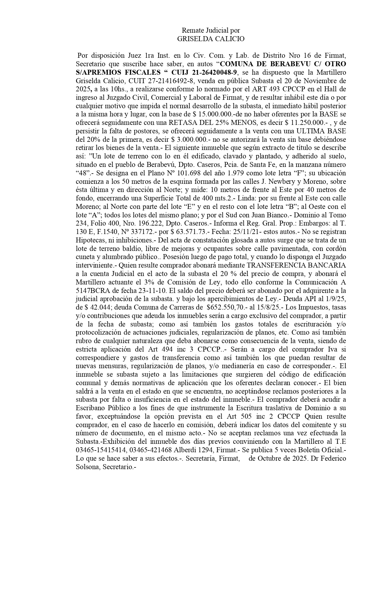 Subasta Judicial en Beravebú